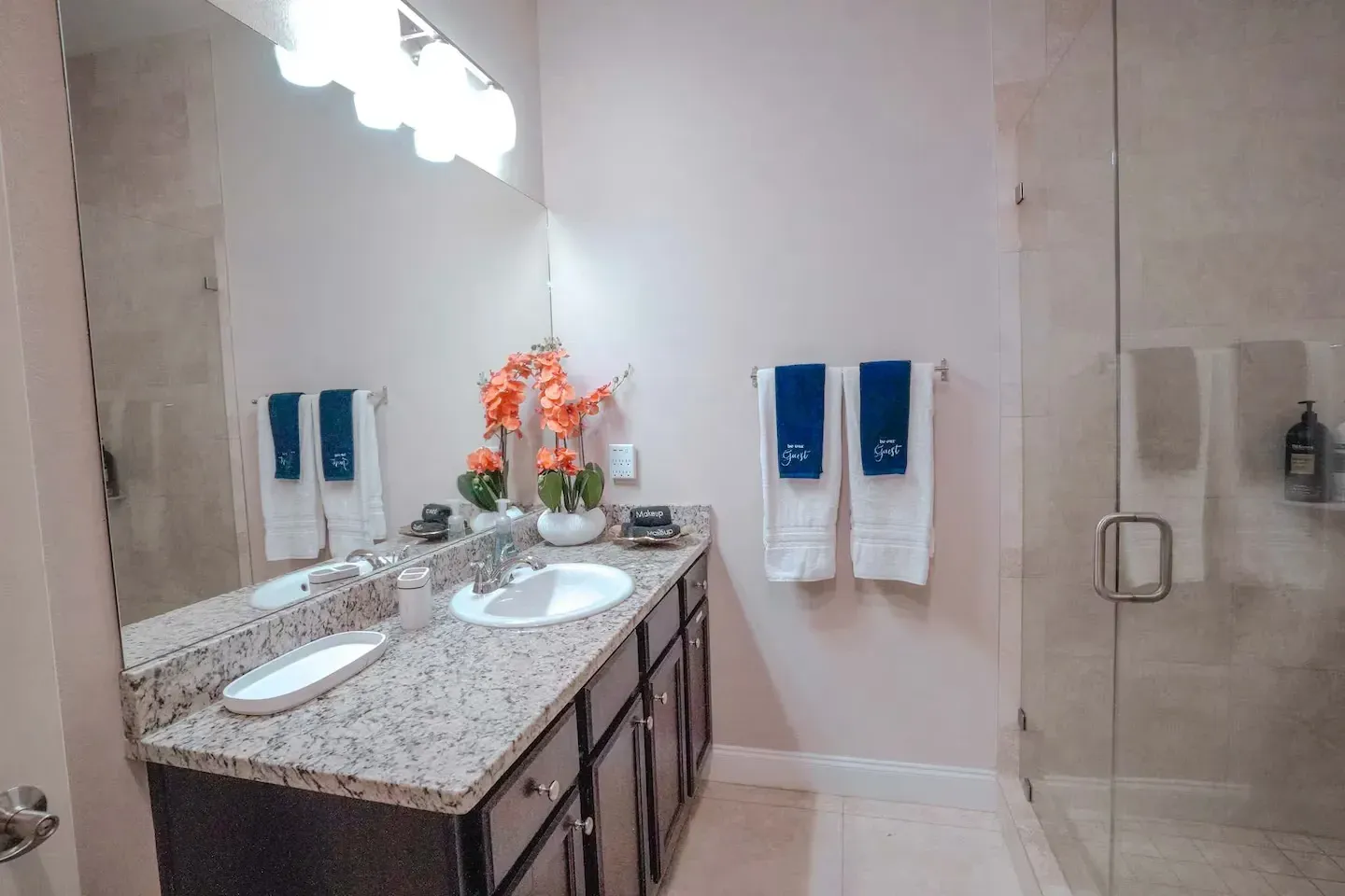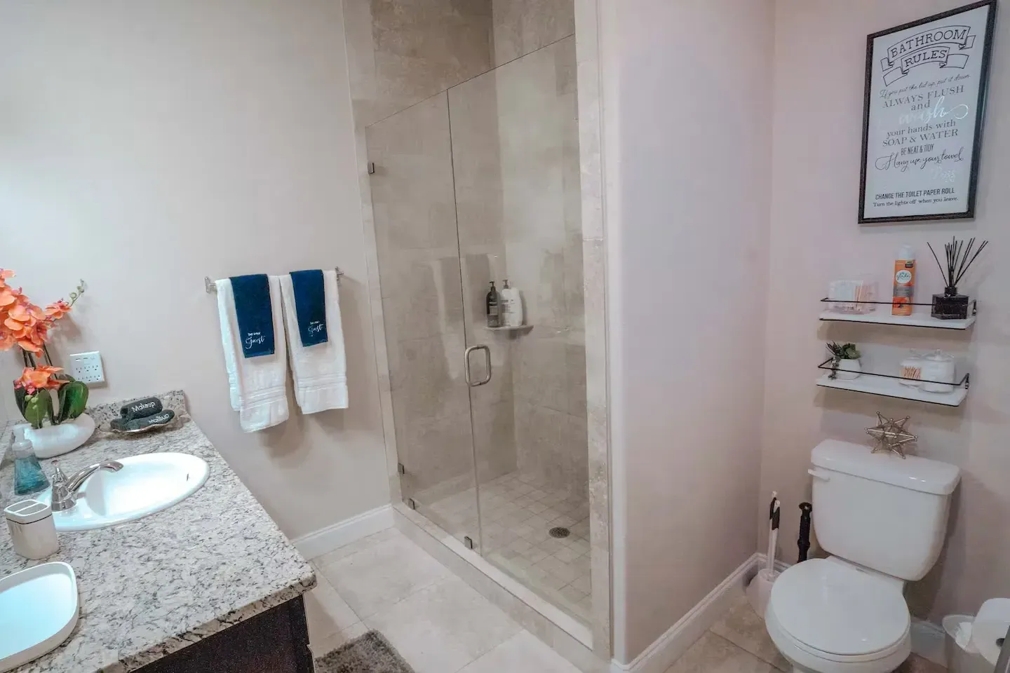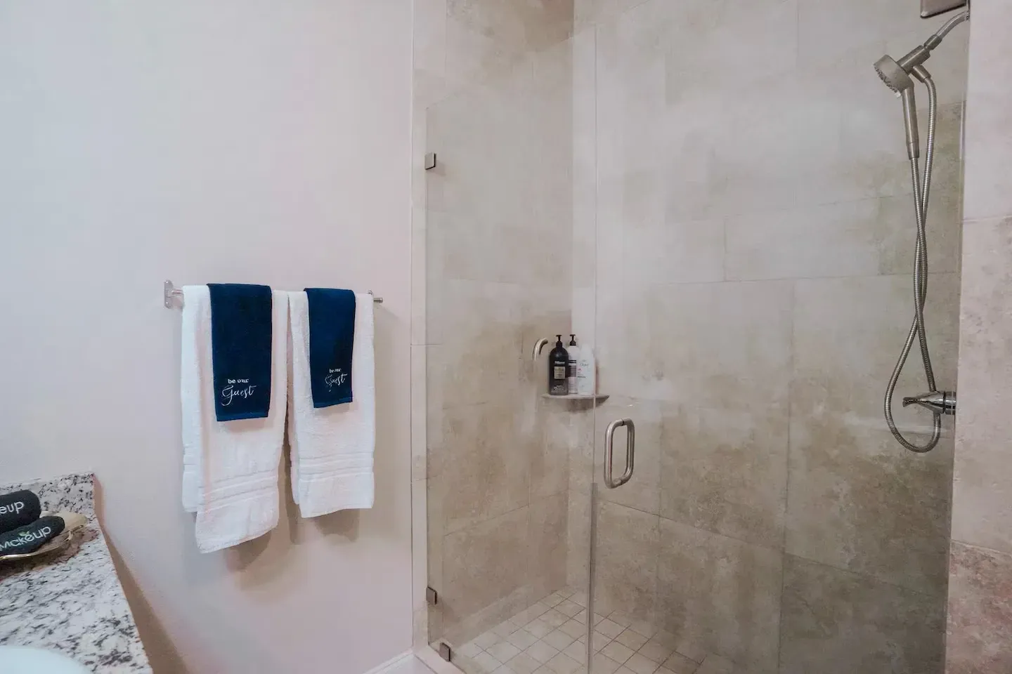 Retreat to the serene master bedroom, boasting a luxurious king-sized bed and generous space for relaxation. The adjacent bathroom features a spacious, beautifully designed shower with a sleek glass door.