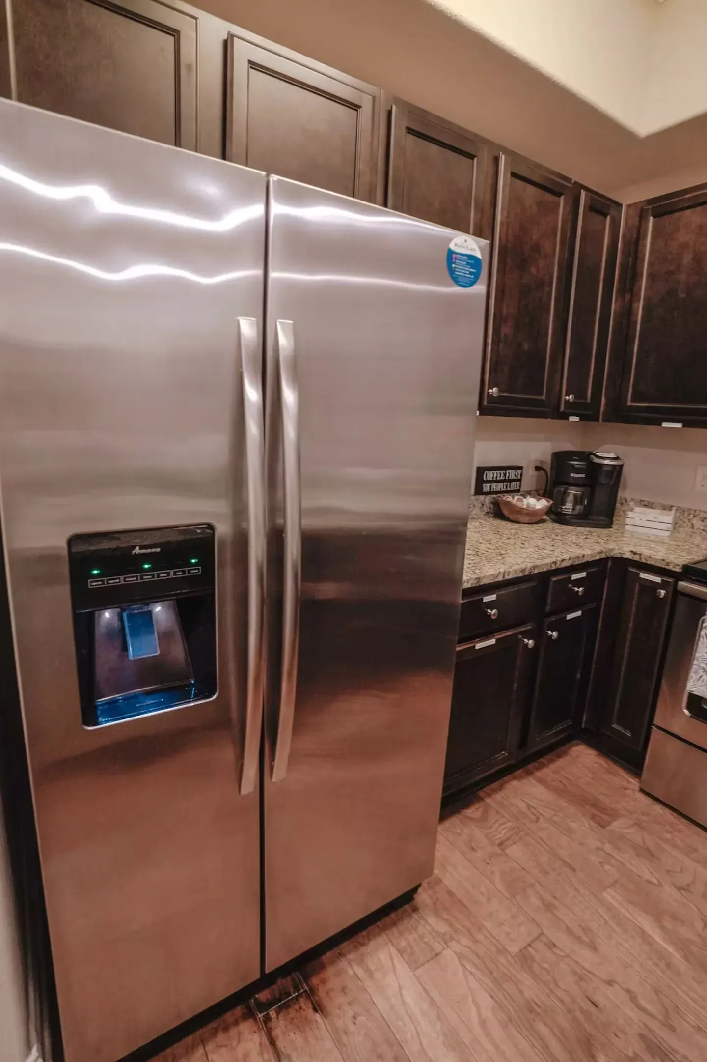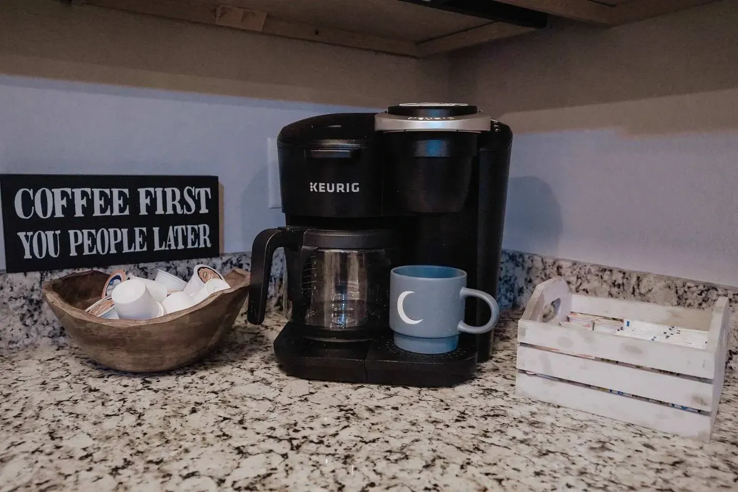 Our thoughtfully appointed kitchen is fully equipped to cater to your every need, featuring a stove, refrigerator, and coffee maker, ensuring you feel right at home. Enjoy preparing meals and gathering around the dining area, designed to comfortably seat our cherished guests.