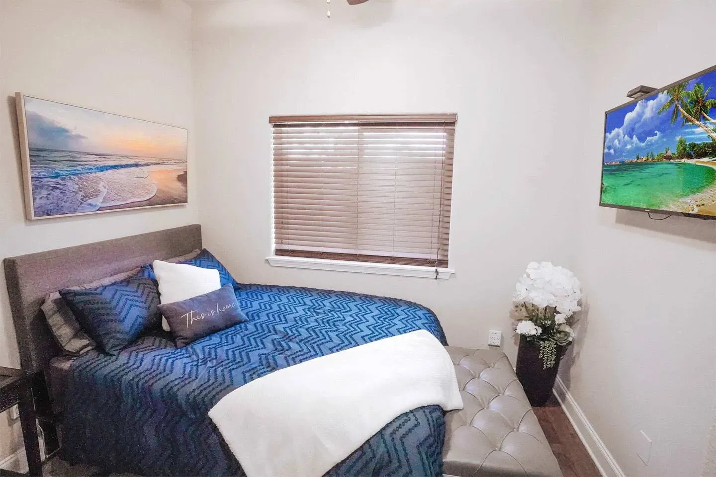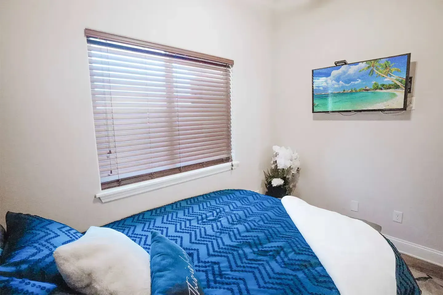 The charming second bedroom, furnished with a queen-sized bed, provides a cozy haven for your guests. The second bathroom offers a relaxing soaking tub.