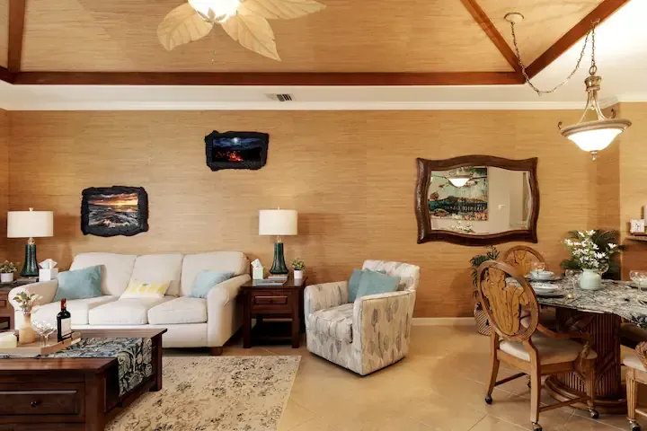 Our master bedroom features a king bed, on-suite bathroom, and magnificent views of the golf course and lake. The second bedroom includes a queen bed and an adjacent bathroom. The villa boasts a full kitchen with stainless steel appliances, bar seating, granite countertops, and everything you need to prepare gourmet meals, including a Keurig coffee maker and blender for your tropical drinks.