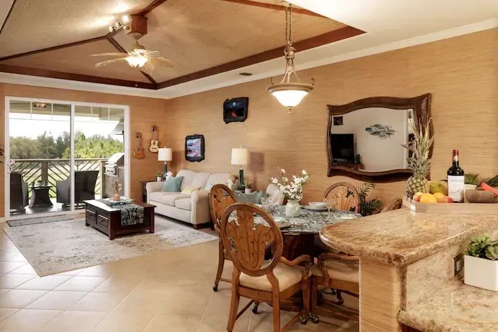 Indulge in pure luxury and escape to paradise at our exquisite villa, located in an exclusive gated community on the breathtaking Big Island of Hawaii. From elevator access to unparalleled mountain, lake, and golf course views, our fully-equipped 2 bed, 2 bath Polynesian-style villa is sure to leave you in awe.