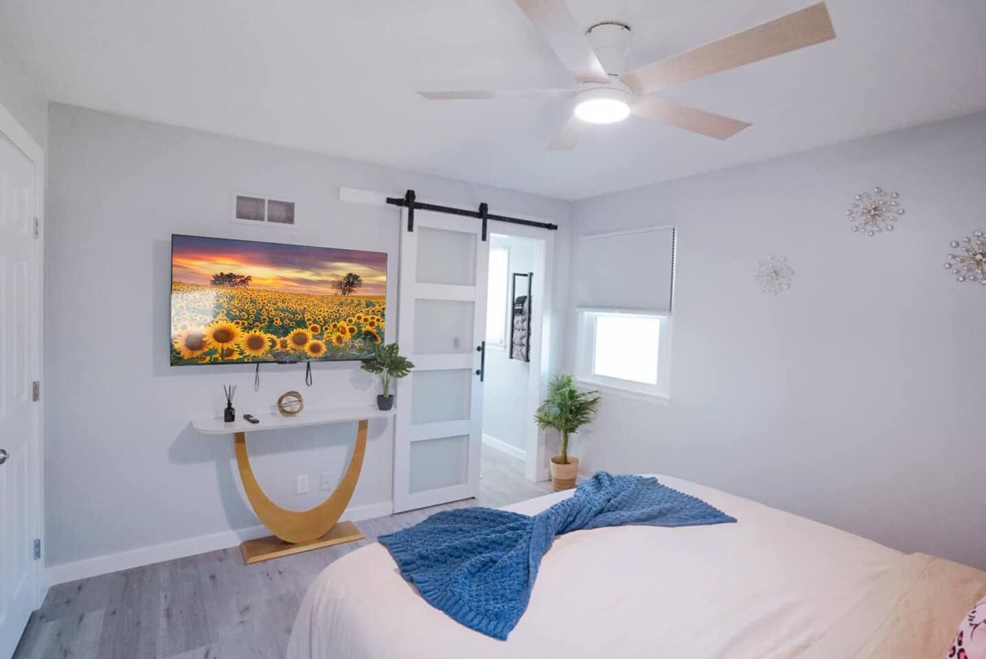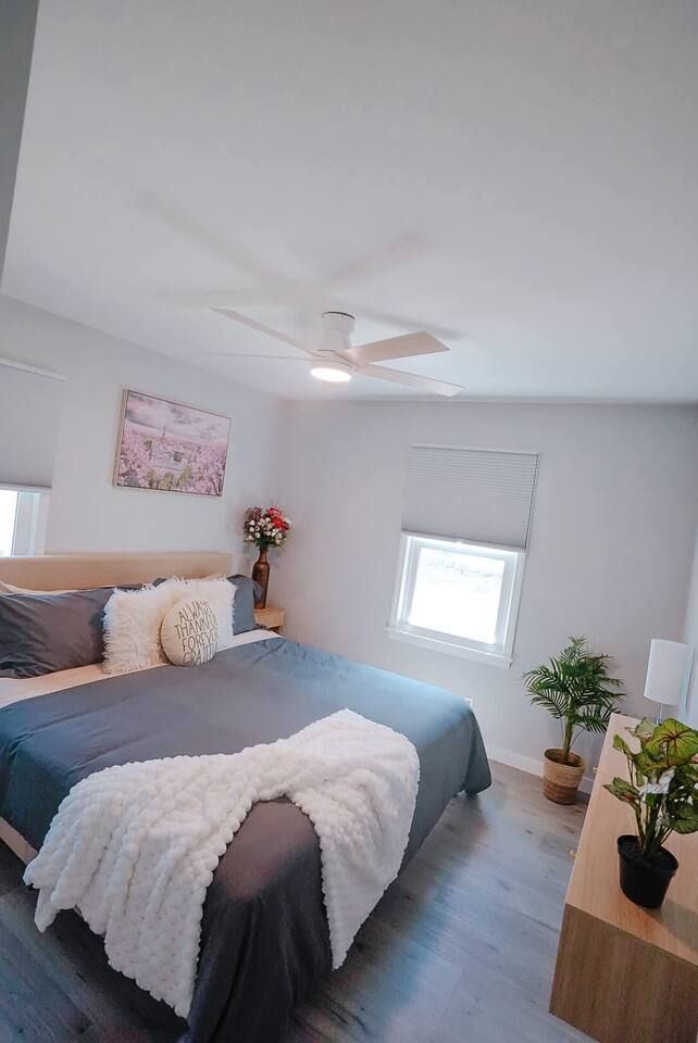 - The primary bedroom features a king-size bed, providing a calm and restful retreat.