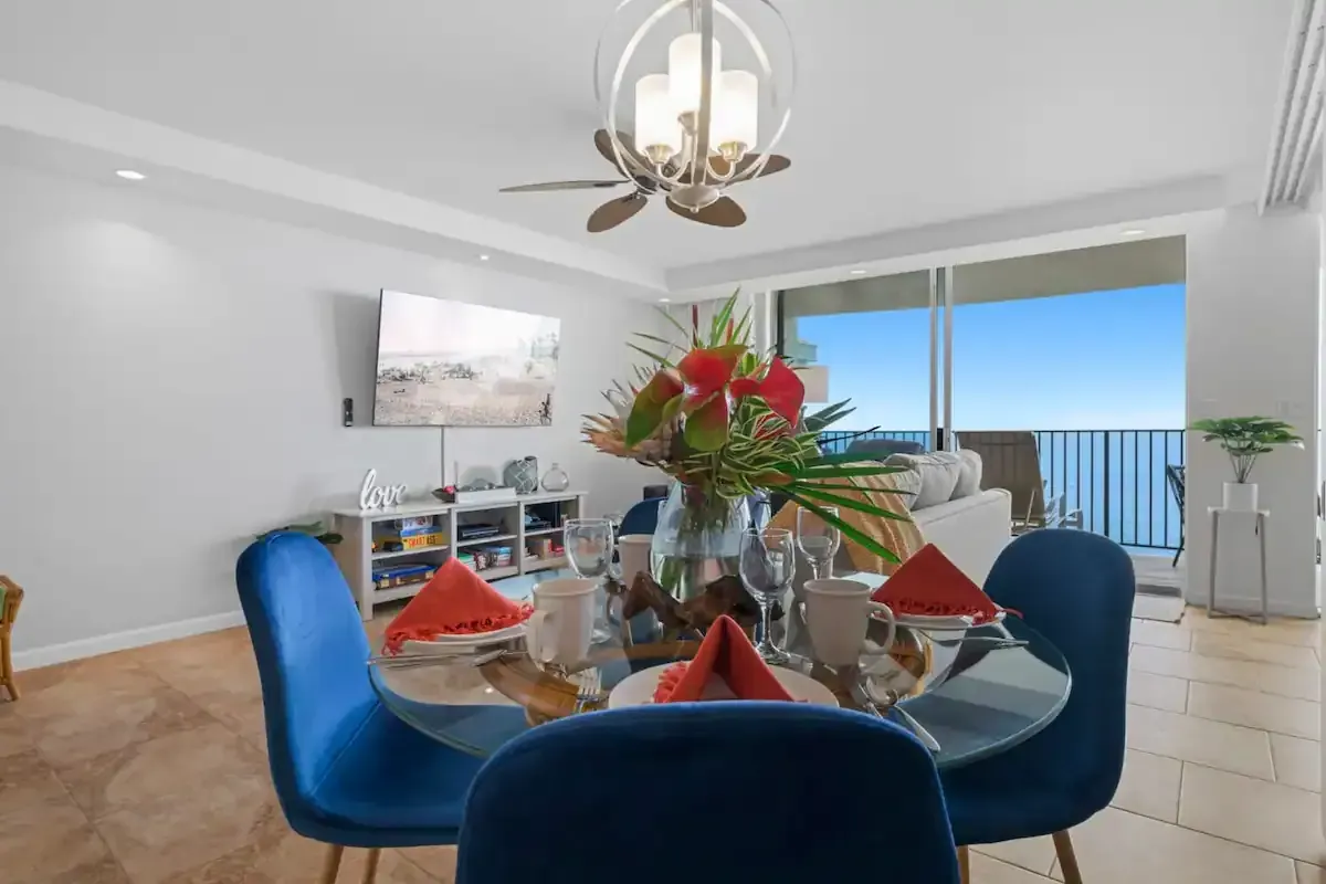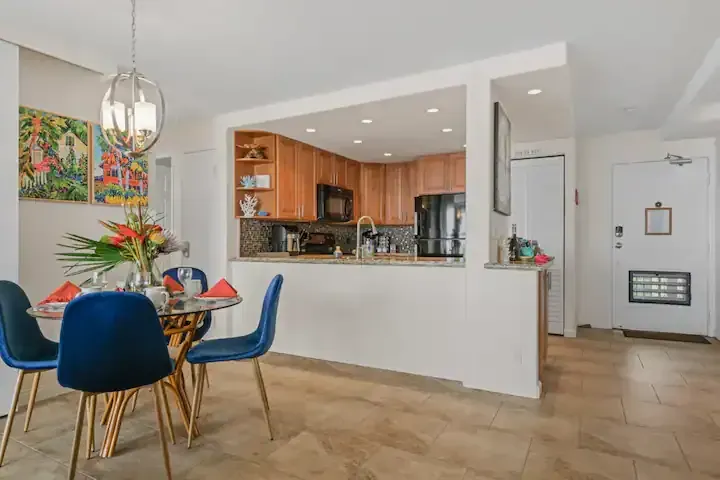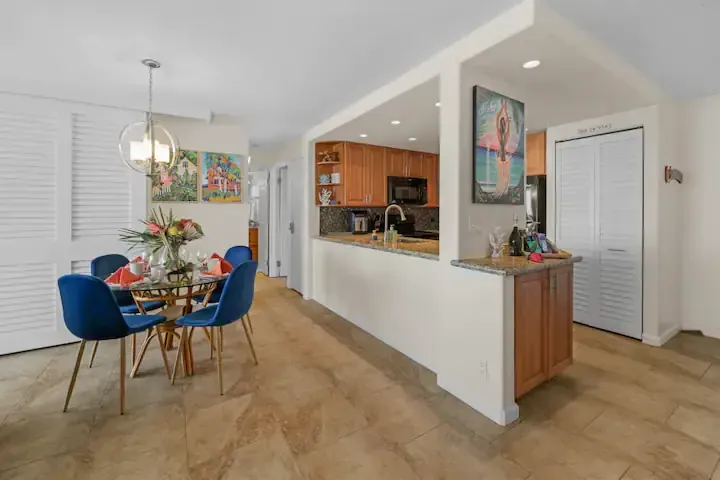 This full-sized kitchen has everything and we mean everything. Washer and Dryer, Oven, microwave, air fryer, Keurig, all the necessities to make an amazing meal. The dining table seats four and there is room at the island for two more.