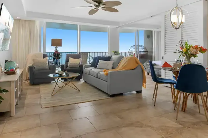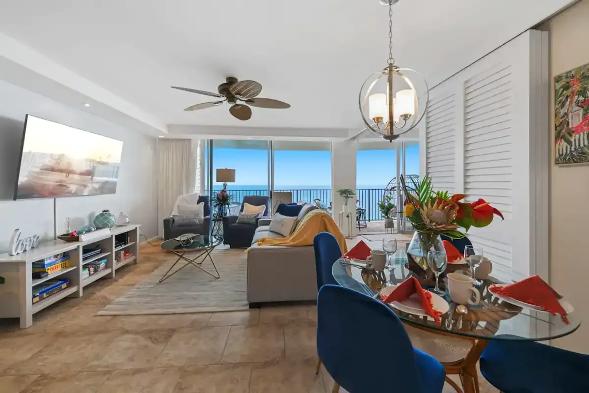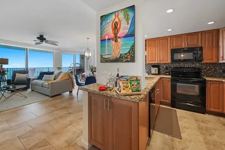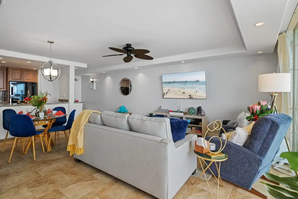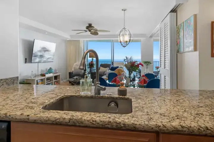 As you walk in, the view of the ocean will take your breathaway. The living room and full sized kitchen are filled to the brim with amenities! To the right, you will see a hallway that leads to your back bedroom, the main bathroom, and the front bedroom.