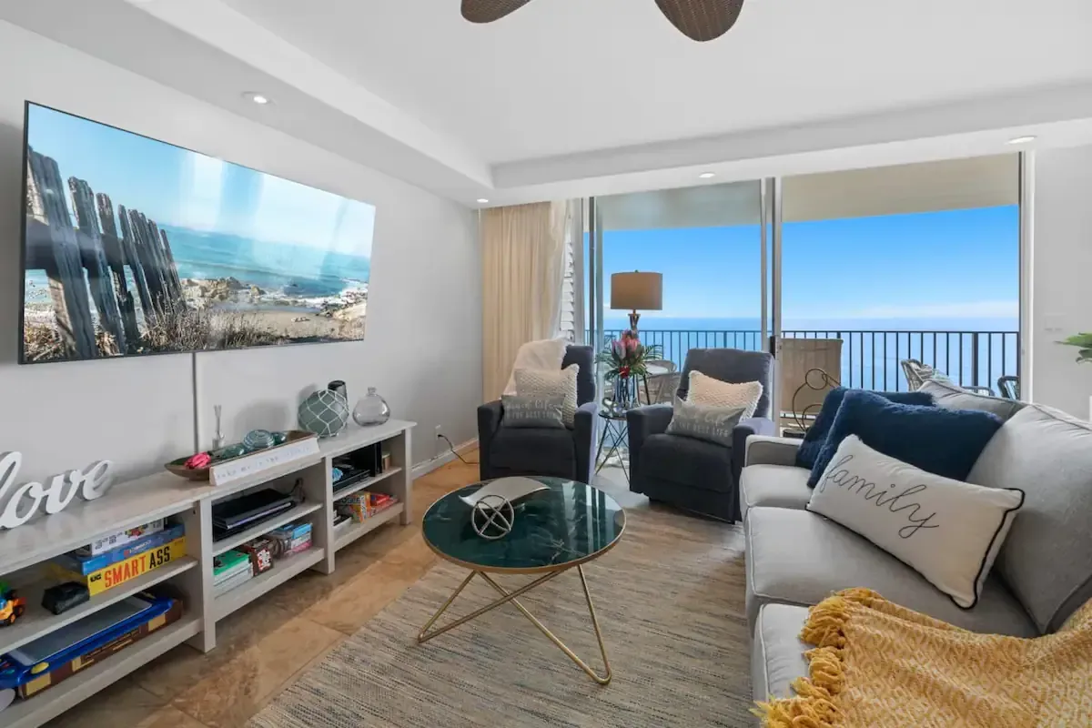 This living are has a queen sized sofa bed and has a modern and breezy design. A Smart tv, and lots of board games, toys, and two more chairs for relaxing. There is also a station for those who need a space to catch up on any work!