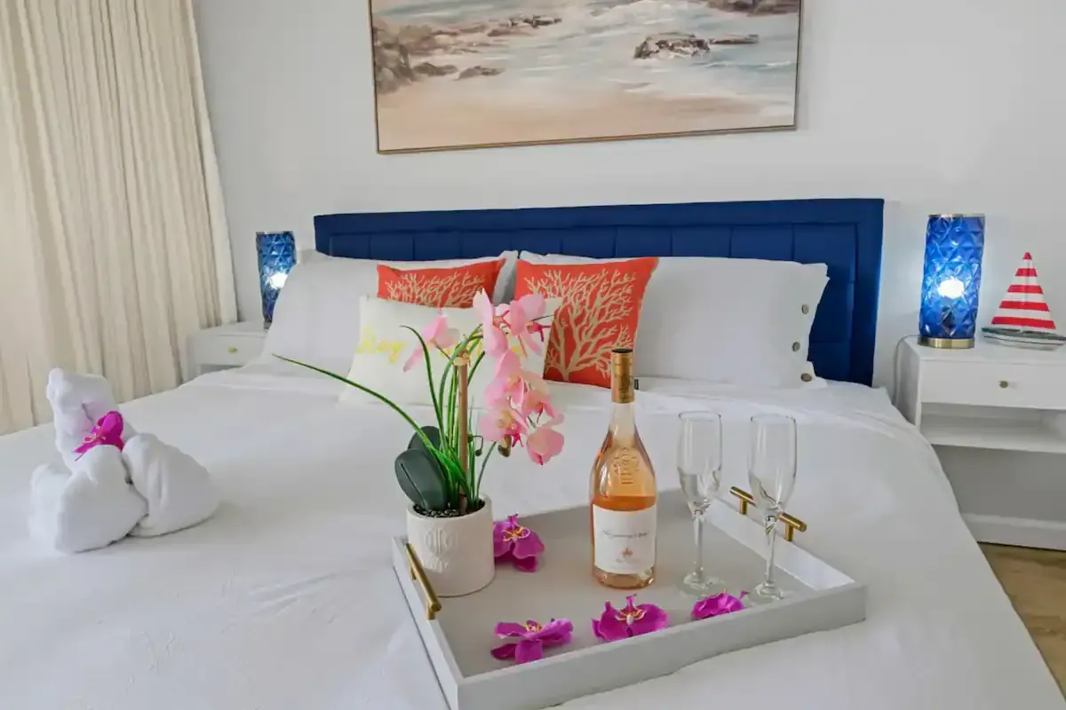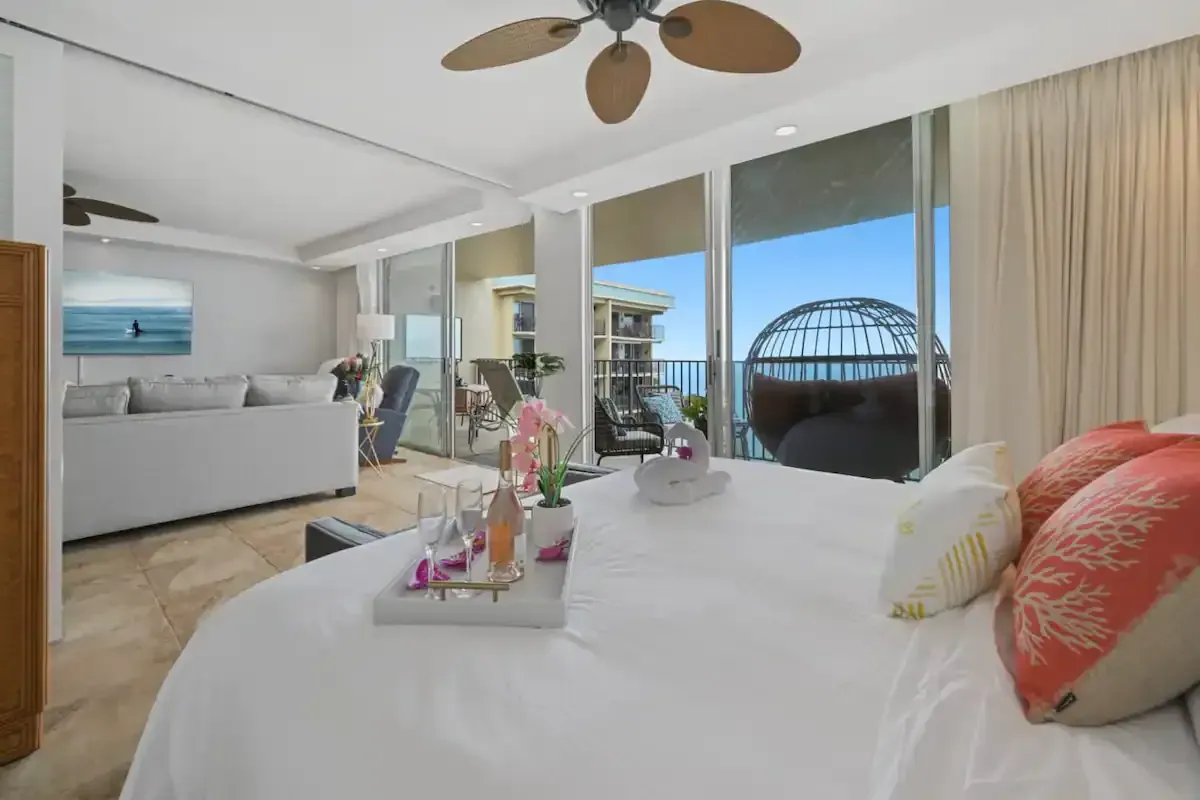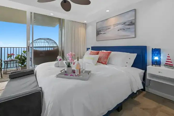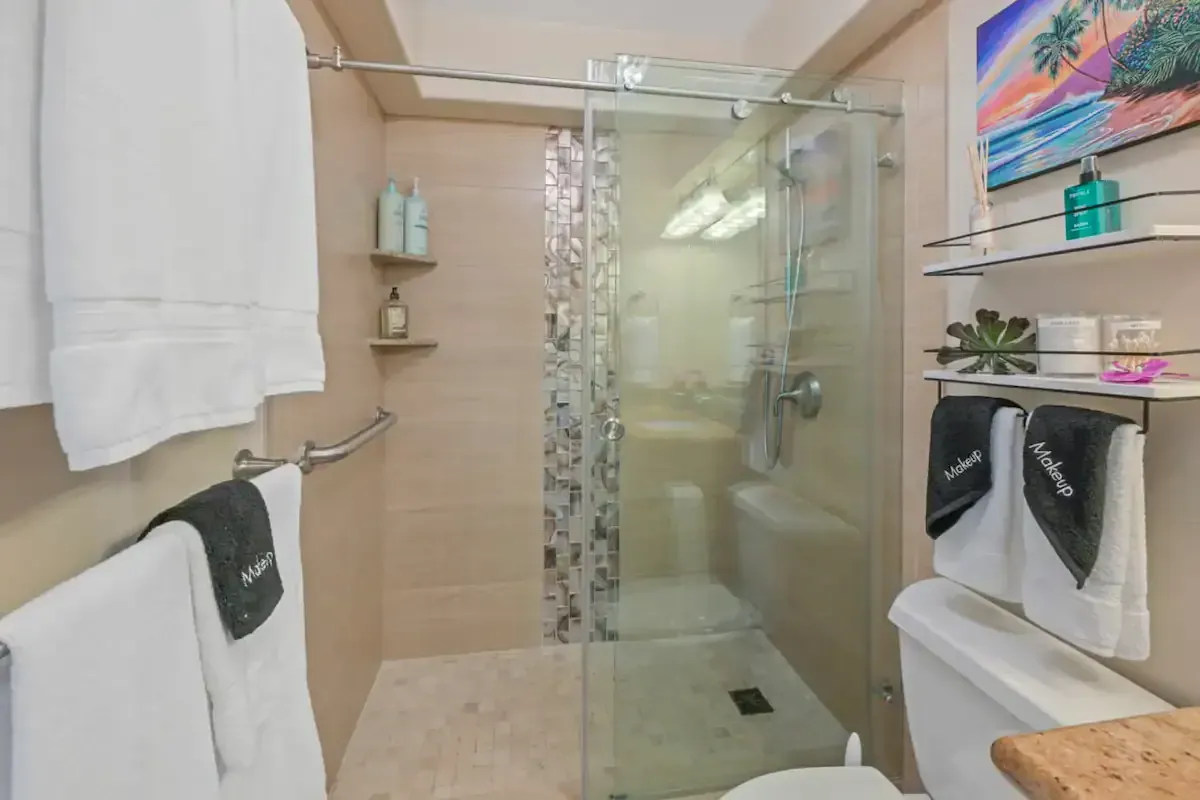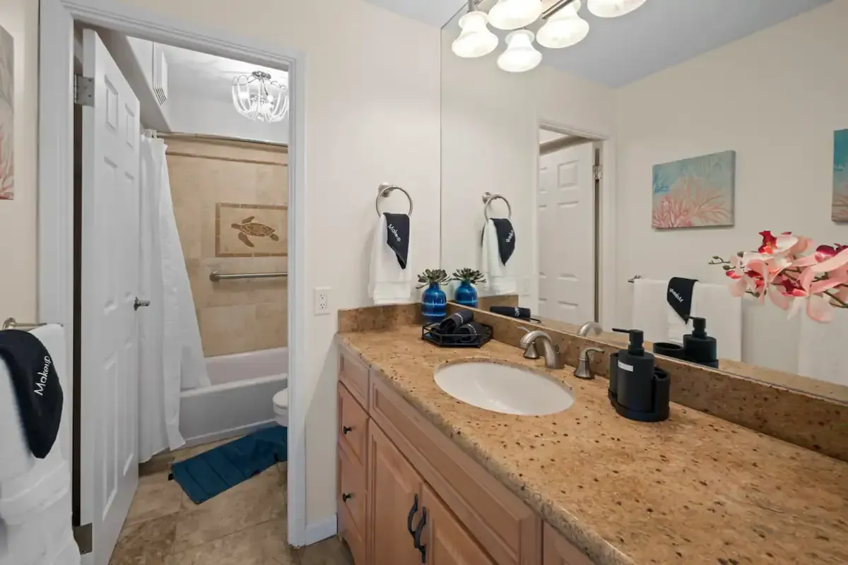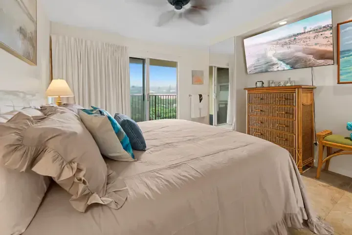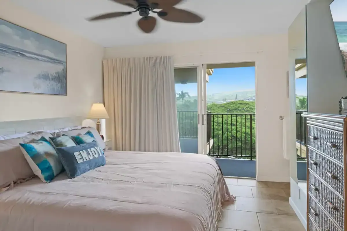 The back bedroom has a king sized bed, it's own ensuite bathroom with a bath tub, smart tv, and a lanai with it's own stunning view of the island. The main bathroom as a large shower, and both bathrooms have all the hygiene necessities you will need. The front bedroom has a king bed, private access to the lanai in the front, so you can wake up and step out to breathe in the fresh air while gazing out into the wide ocean.